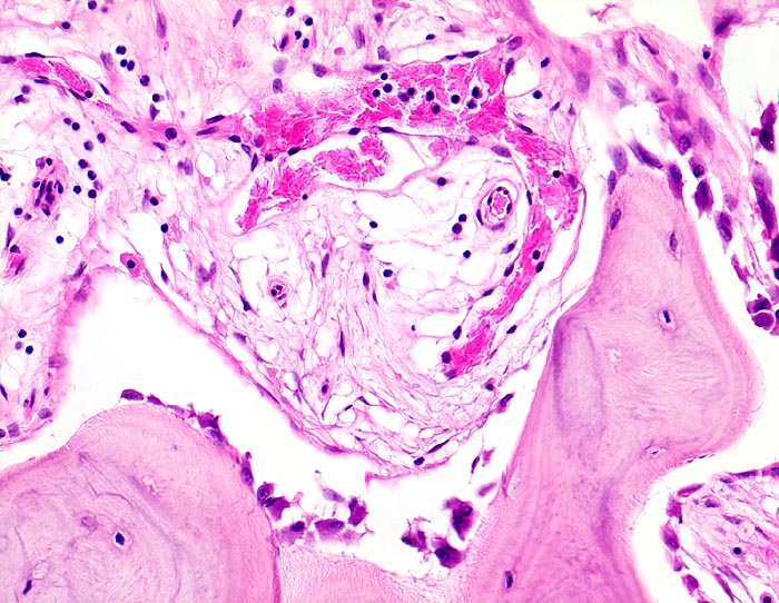 Zone mit gesteigertem Knochenanbau. Das Spongiosabälkchen ist von einer Osteoblastentapete bedeckt, welche neuen Knochen anbauen. Das Mark zeigt eine lockere Fibrose mit vermehrten kapillären Gefässen.