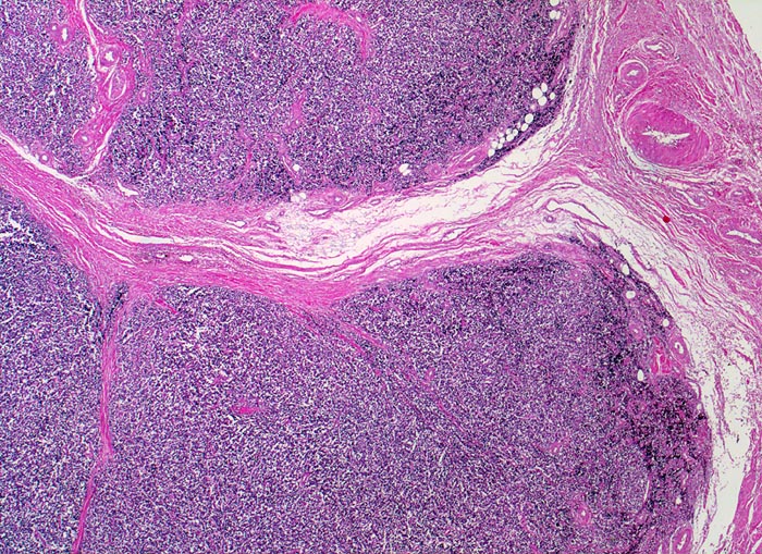 Auffallend monotoner dichter Tumorzellrasen mit lobulärer Architektur (d.h. durch Bindegewebssepten abgegrenzte Knoten).
