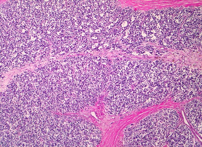 Monotoner Rasen kleiner runder blauer Tumorzellen durchzogen von bindegewebigen Septen.