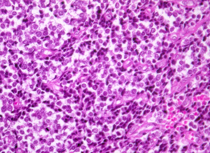 Mischung von kleinen runden Zellen und gequetschten dunkler färbenden Zellen. Zwischen den Tumorzellen kleine Blutgefässe.