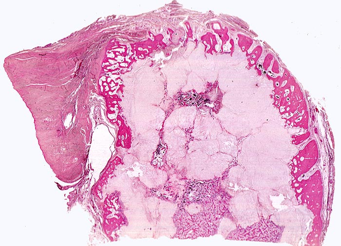 Zungenförmige Tumorausläufer infiltrieren die angrenzende Kortikalis.