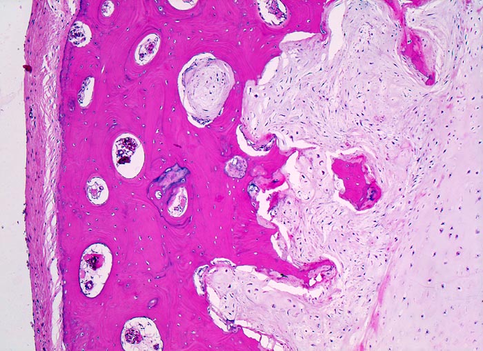 Kortikaler Knochen bedeckt von Periost. Das Sarkom (rechts im Bild) infiltriert und destruiert die Kortikalis. Im Bereich der Invasionsfront ist die Zellularität leicht gesteigert.