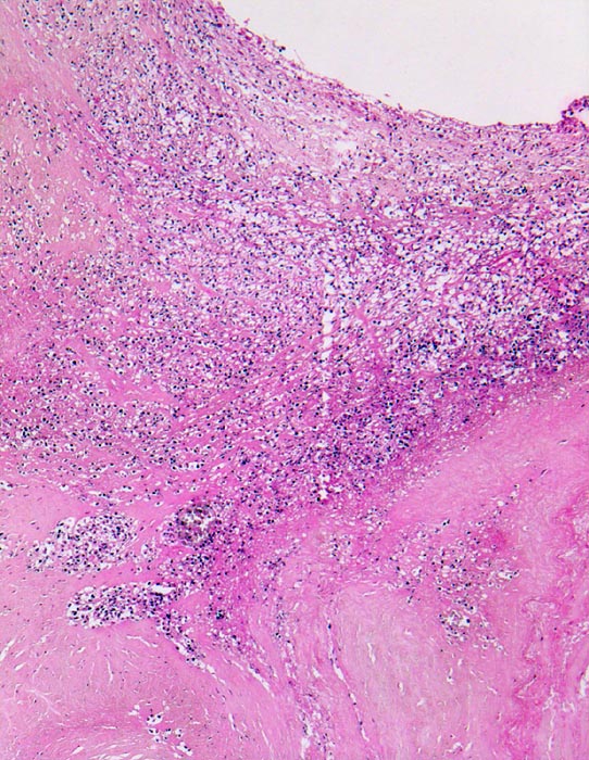 In dem Zwickel zwischen noch erhaltener Klappe und Polyp beginnende Granulationsgewebsbildung.