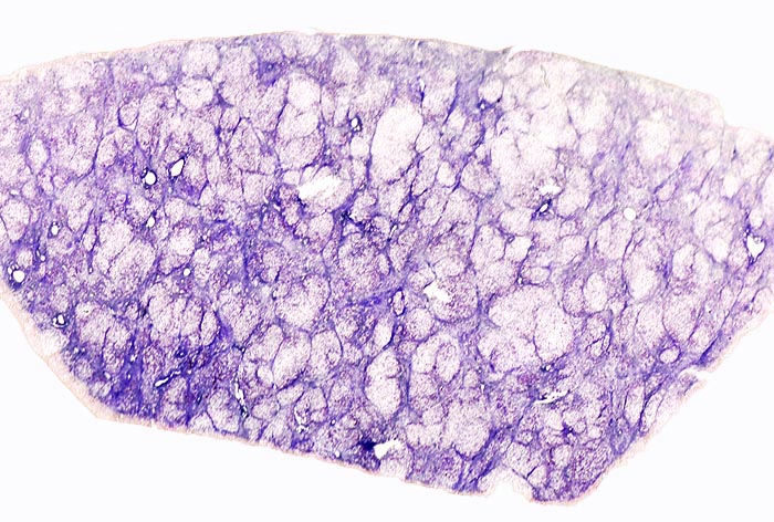 Diffuser knotiger Umbau und Fibrose (blau) des Leberparenchyms. Das Parenchym ist massiv verfettet. Da das Fett durch die Fixation herausgelöst wurde, ist das verfettete Parenchym transparent.