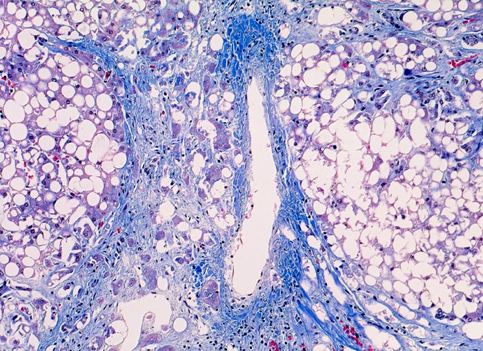 Die ausgeprägte Steatose weist auf einen aktuell bestehenden Alkoholabusus hin. Die breiten Bindegewebssepten sind typisch für die aethylisch bedingte Zirrhose.