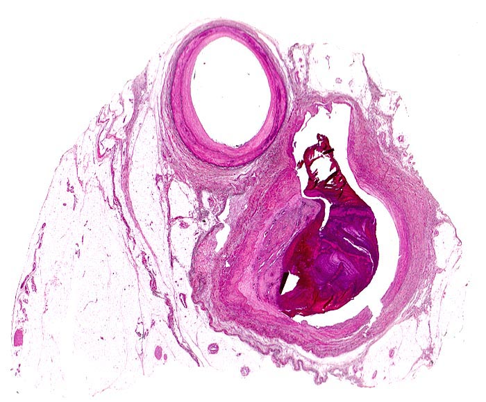 Beinarterie mit begleitender Vene. Über einer verdickten Stelle in der Intima der Vene haftet ein partiell organisierter gemischter Thrombus mit Anteilen eines geschichteten Korallenstockthrombus=Abscheidungsthrombus und einem aufgelagerten Gerinnungsthrombus ohne erkennbare Schichtung.