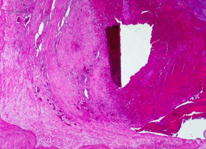 Rechts im Bild die Venenthrombose. Links die verdickte und sklerosierte Intima mit Gefässneubildungen. Der Thrombus wird durch Granulationsgewebe organisiert. Dadurch haftet der Thrombus an der Venenwand.