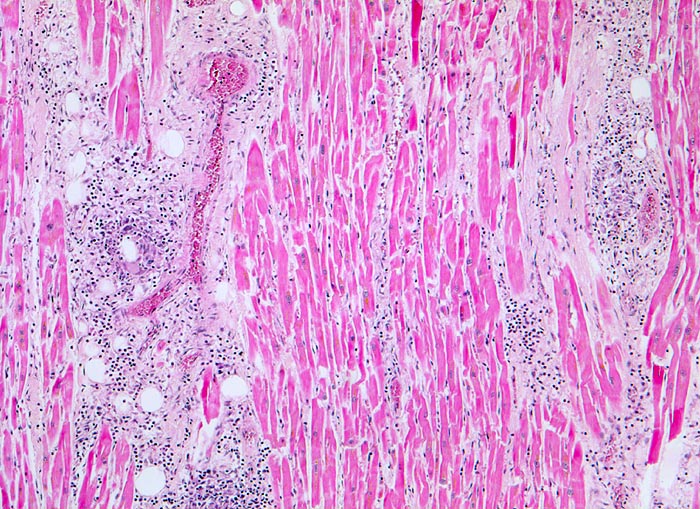 Im Intersitium, besonders perivaskulär und zwischen den Gefässbündeln zahlreiche Herde von gemischten Entzündungsinfiltraten.