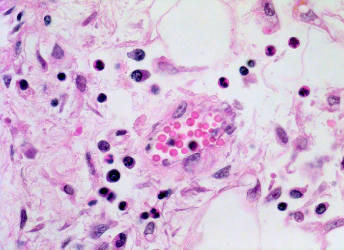 Ödematöses Intersitium mit lockerem Infiltrat bestehend aus Lymphozyten, Plasmazellen, Histiozyten und Granulozyten. Daneben spindelige Fibroblasten.