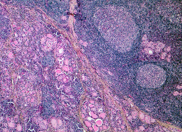 Mikrofollikuläres Schilddrüsenparenchym mit wenig Kolloid. Das Parenchym wird infiltriert und partiell zerstört durch ein dichtes lymphoides Entzündungsinfiltrat mit sekundären Lymphfollikeln. Stellenweise sind nur kleine Epithelinseln im Entzündungsinfiltrat stehengeblieben.