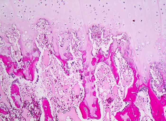 Übergang der hyalinen Knorpelkappe in den knöchernen Stiel über eine enchondrale Ossifikationszone. Die verkalkte Knorpelgrundsubstanz wird teilweise abgebaut und durch Osteoid ersetzt. Das Osteoid wird gebildet von zahlreichen Osteoblasten, welche dem neugebildeten Knochen aufsitzen.