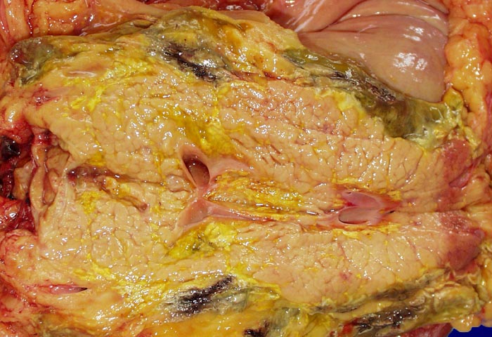 Frische fleckförmige Nekrosen des Pankreasparenchyms und des peripankreatischen Weichteilgewebes (hellgelbe und grünliche Areale).