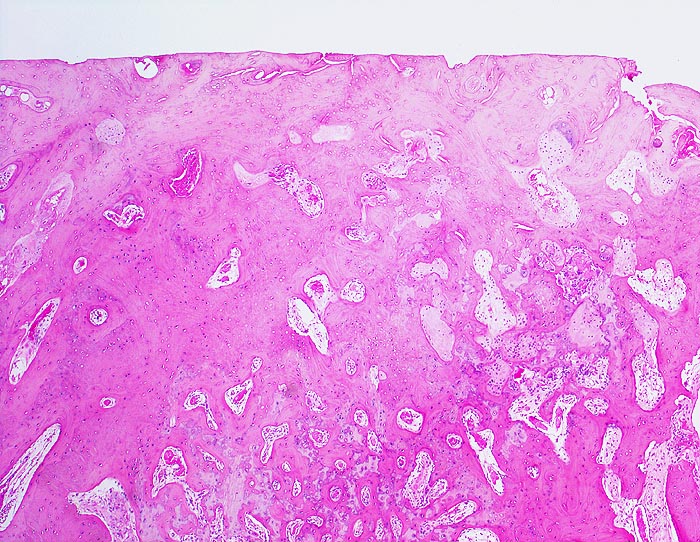 Teilvergrösserung: Osteosklerose (Eburnisation) des subchondralen freiliegenden Knochens mit deutlicher Verdichtung der Knochenstruktur. In der Gelenkfläche mehrere kleine Bezirke mit Faserknorpel, der metaplastisch entstanden ist.