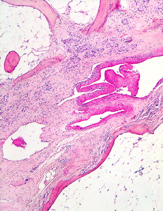 Die Gelenkflächen sind durch bindegewebiges Pannusgewebe zerstört, welches den Gelenkknorpel resorbiert hat. Der Pannus überbrückt und fixiert den Gelenkspalt. Wenig Fibrinauflagerungen im Gelenkspalt.