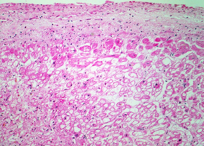 Die hypoxisch bedingte vakuoläre (=tubuläre) Degeneration beruht auf einem Verlust der Myofibrillen und Glykogenspeicherung. Die zentral leeren Myokardzellen werden auch Holundermarkzellen genannt. Die veränderten Kardiomyozyten sind noch vital aber können sich nicht mehr kontrahieren. Das Auftreten der vakuolären Degeneration ist korreliert mit Herzinsuffizienz.