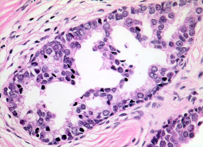 Grösserer Drüsenschlauch mit komplexen mikropapillären und kribriformen Epithelproliferationen. Die Epithelzellen haben vergrösserte atypische Kerne mit deutlich erkennbaren Nukleolen. Eine Basalzellschicht ist erkennbar.
