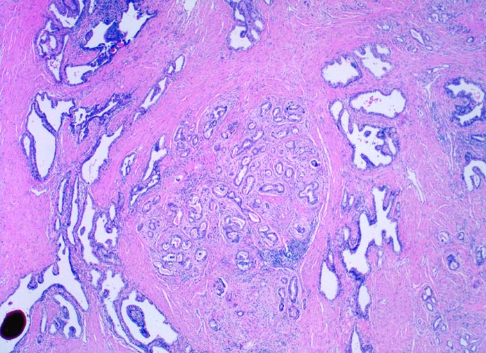 Neben grossen normalen Prostatadrüsen mit grossen Lumina ist in der Übersicht ein gut umschriebener Herd dicht gelagerter mittelgrosser gut geformter Drüsen mit intraluminalem Sekret erkennbar. Innerhalb dieses Karzinomherdes sind keine normalen Drüsen erkennbar. Das Karzinom infiltriert also nicht das Normalgewebe. Dieser Tumorherd entspricht einem Gleason Grad 2. Eingedicktes Sekret mit Ausbildung eines Corpus amylaceum in einer benignen Drüse.