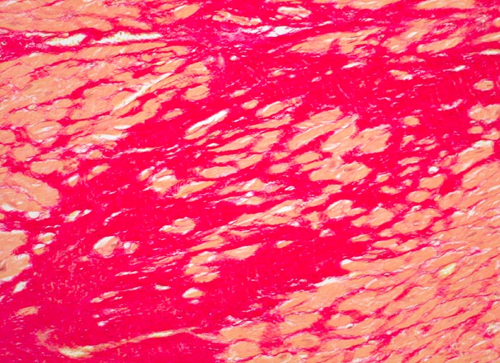 Grosse, teils kontinuierliche, teils diskontinuierliche Abschnitte der Muskulatur ersetzt durch siriusrote, z.T. wellige Kollagenfaserbündel. Narbe arm an spindeligen Fibroblasten/Fibrozyten = alte Narbe. Fleckförmig überlebende (gelbe) Muskelfasern.