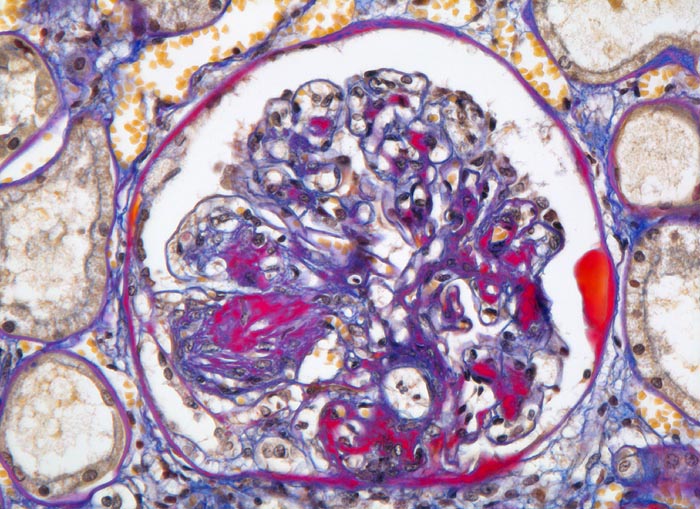 Noduläre Glomerulosklerose: Zwiebelschalenartig geschichtete, azelluläre Knoten im Mesangium. Primär leichte Hyperzellularität der Noduli. Im Allgemeinen folgt die noduläre Glomerulosklerose der diffusen (fingerförmige Proteinablagerungen) Glomerulosklerose vor allem bei Typ I Diabetes. Die noduläre Glomerulosklerose ist aber nicht einfach eine besonders schwere Form der diffusen, sondern wahrscheinlich eine unabhängige Erkrankung mit anderer Pathogenese.
