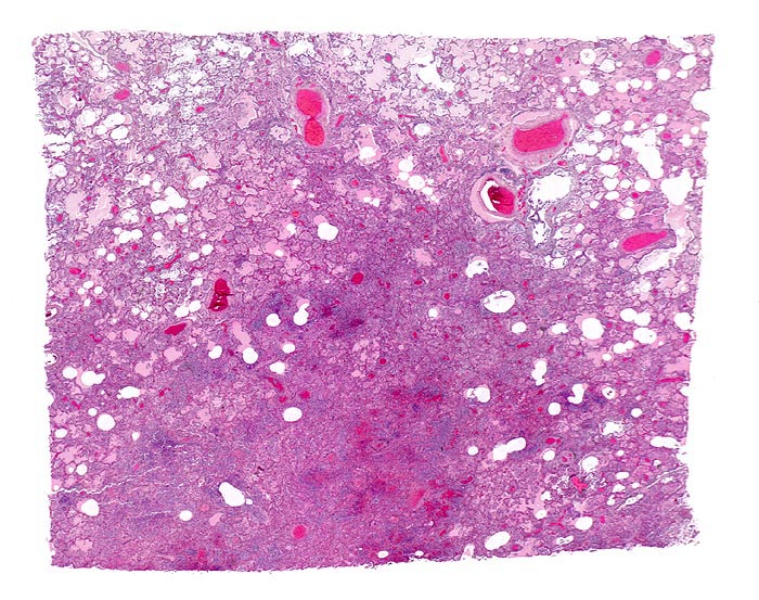 Die Alveolen sind gefüllt mit rosafarbener Ödemflüssigkeit. Der unscharf begrenzte bläuliche Herd entspricht einem pneumonischen Infiltrat (Herdpneumonie) mit intraalveolärer Ansammlung neutrophiler Granulozyten.
