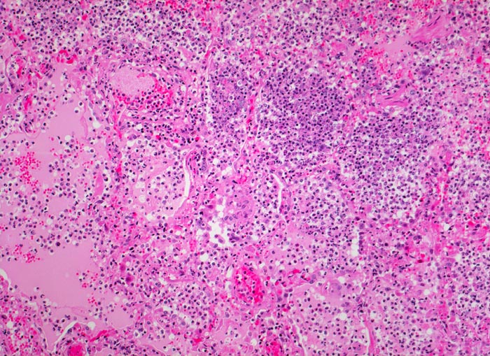 Pneumonisches Infiltrat: die Alveolen sind gefüllt mit neutrophilen Granulozyten und rosafarbener Ödemflüssigkeit. Die Alveolarkapillaren sind hyperämisch.