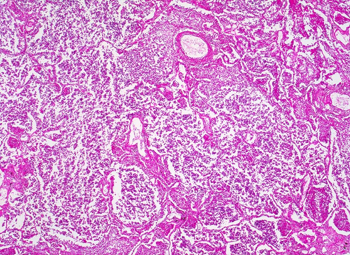 Alle Alveolen sind gleichmässig und diffus befallen und im selben Stadium der Entzündung. Sie sind angefüllt mit fädigem Fibrin und neutrophilen Granulozyten.