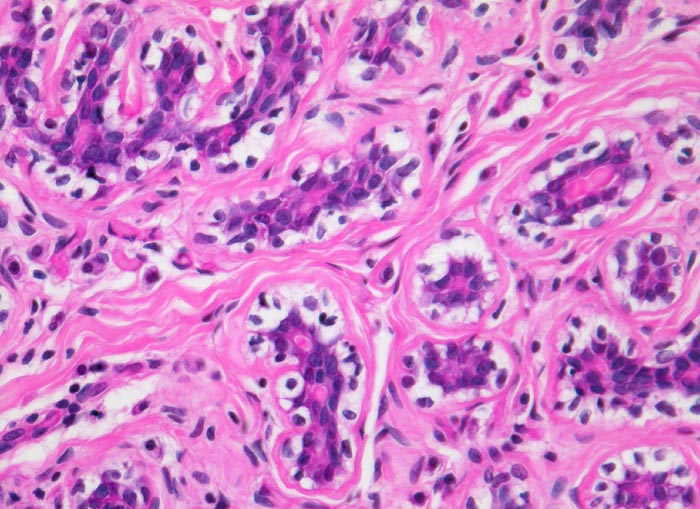 Die Tubuli des Mammaläppchens sind ausgekleidet durch ein einreihiges Epithel. Daran angrenzend die Myoepithelschicht aufsitzend auf einer Basalmembran. Myoepithelzellen mit auffallend balloniertem klarem Zytoplasma. Das Läppchenstroma ist meist etwas lockerer als das interlobuläre Stroma.