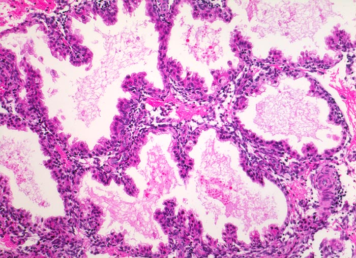 Das Schwangerschaftsendometrium besteht aus stark proliferierten hypersekretorischen ausgeweiteten Drüsen. Das Drüsenepithel bildet papilläre und pseudopapilläre in die Drüsenlumina hineinragende Proliferate. Die Zellkerne des Drüsenepithels sind hyperchromatisch und polymorph (sogenanntes Arias Stella Phänomen).
