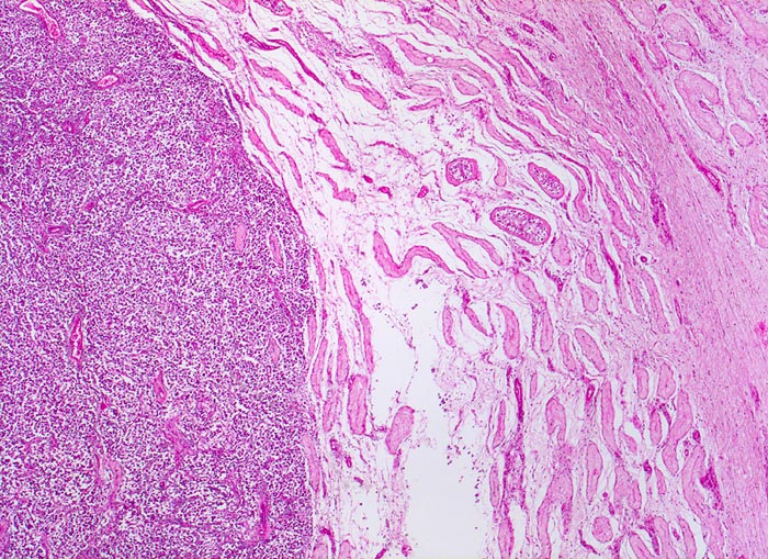Links das zellreiche Tumorgewebe mit expansivem, verdrängendem Wachstum. Das angrenzende Hodenparenchym zeigt eine vollständige tubuläre Atrophie ohne erkennbare Spermatogenese. Vereinzelte Tubuli enthalten atypische Zellen.