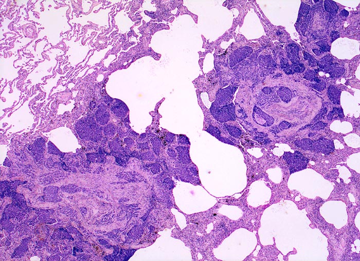 Dunkle solide Tumorinfiltrate füllen erweiterte Lymphgefässlichtungen um einen zentralen Pulmonalarterienast. Der Tumor greift auch auf das angrenzende Parenchym über.