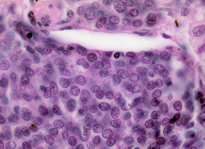 Monomorphe, zytoplasmaarme Tumorzellen mit feinkörnigem Chromatin (sogenanntes Pfeffer und Salz Chromatin neuroendokriner Tumoren) mit unauffälligen Nukleolen. Am Rand des Tumorzellaggregates ist ein Spaltraum erkennbar, welcher durch flache Endothelzellen ausgekleidet wird.