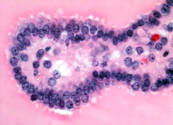 Makropapille mit follikulärem Epithel innerhalb des fibrovaskulären Stromastiels. Das auskleidende Epithel entspricht normalem follikulären Epithel und zeigt nicht die für papilläre Karzinome typische Zytomorphologie.