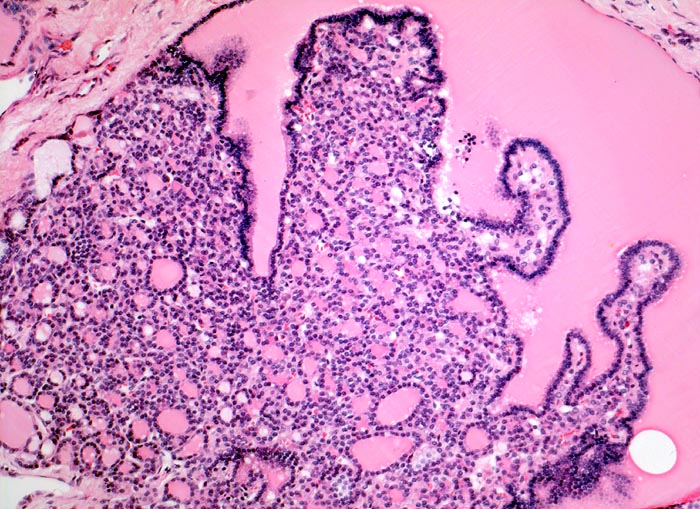 Das Stroma der Makropapille ist ausgefüllt mit Schilddrüsenfollikeln. Das auskleidende Epithel entspricht normalem Follikelepithel.