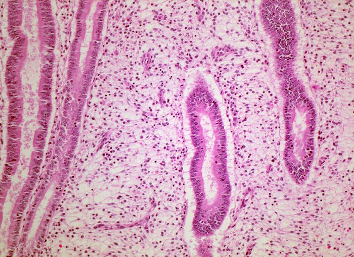 Lange weitgehend gerade verlaufende Drüsenschläuche mit hochzylindrischem Epithel. Stroma ödematös aufgelockert. Kleine längliche kapilläre Gefässe.