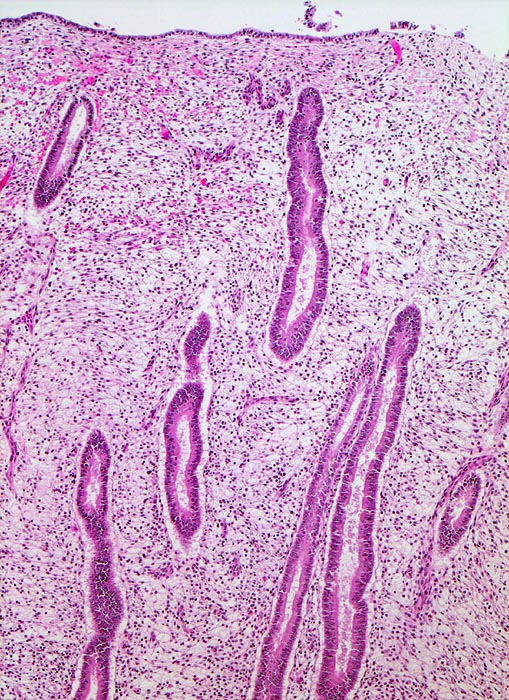 Langgestreckte leicht geschlängelte Drüsen mit hochprismatischem Epithel. Ödematöses Stroma mit länglichen kapillären Gefässen.
