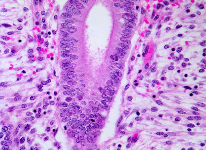 Epithel hochzylindrisch, Kerne länglich chromatinreich mit Mitosen. Stroma aufgelockert.