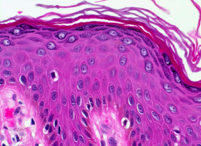 Lockeres Stratum papillare der Dermis mit oberflächlichem Gefässplexus dicht am Papillarkörper. Leicht braun pigmentierte Basalzellschicht mit eingestreuten Melanozyten mit sternförmigen Zytoplasmaausläufern. Schmales Stratum granulosum und zellfreie Hornschicht des Stratum corneum. Langerhanszelle im Stratum spinosum.