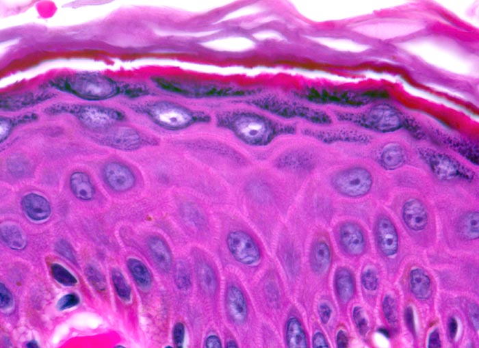 Leicht braun pigmentierte Basalzellschicht. Zellen des Stratum spinosum mit deutlich erkennbaren Desmosomen zwischen den Plattenepithelzellen (deshalb der Name "Stachelzellschicht"). Zellen des Stratum granulosum mit blauen Keratohyalingranula. Zellfreie Hornschicht des Stratum corneum.