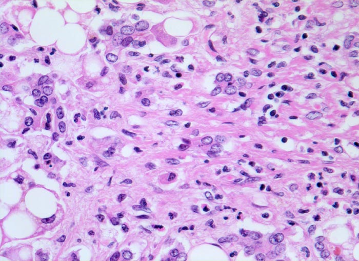 Fibrös verbreitertes Portalfeld mit proliferierten Ductuli und lockerem gemischtem Entzündungsinfiltrat. Grobtropfig verfettete Hepatozyten.
