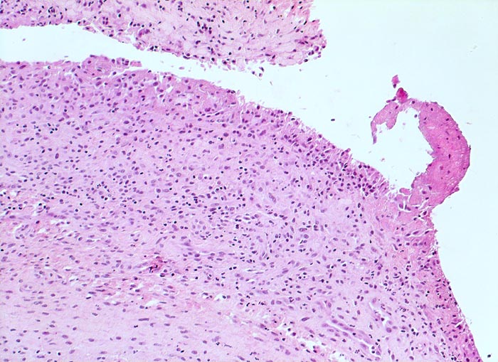 Deckzellschicht. Lockeres gemischtes Entzündungsinfiltrat im Stroma. Fokale