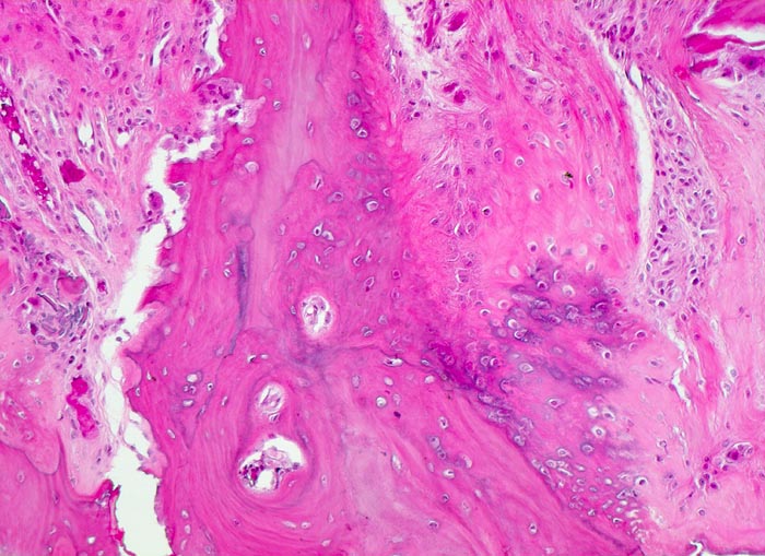 Gesteigerte Umbauphänomene in der Nekrosezone: Ortsständiger Lamellenknochen wird als Leitschiene zur Fasernknochenneubildung benutzt. Auf der gegenüberliegenden Seite wird der Lamellenknochen von Osteoklasten resorbiert. Kleine avitale Knochensequester. Granulationsgewebe.