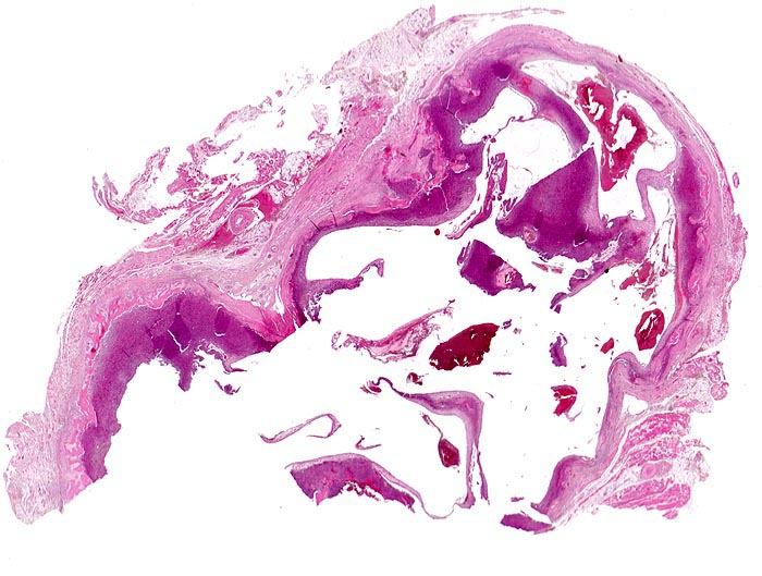 Kavernöse blutgefüllte Hohlräume mit dazwischengelegenen Septen. Knochengewebe am Rand der Hohlräume.