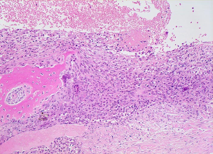 Pseudozystischer Hohlraum ohne Epithelauskleidung gefüllt mit Blut. Die Pseuozystenwand enthält Riesenzellen und mononukleäre Zellen angrenzend an zellarmes kollagenes Bindegewebe. Daneben sieht man neugebildeten Faserknochen.