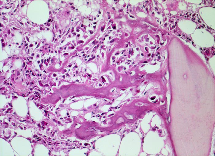 Erhaltenes Spongiosabälkchen aus Lamellenknochen. Die Tumorzellen benutzen das ortsständige Knochengewebe als Leitschiene zum Anbau von Tumorosteoid.