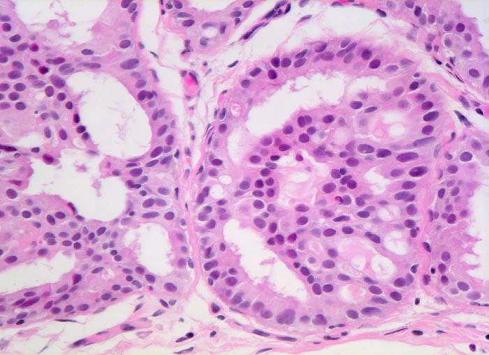 Erweiterte Gänge angefüllt mit proliferiertem Epithel. Im Gegensatz zu einem duktalen Carcinoma in situ sind die proliferierten Zellen polymorph. Teilweise entsteht der Eindruck "fliessender" Zellen. Die vorhandenen Hohlräume sind nicht kreisrund, sondern unregelmässig verzogen und randständig schlitzförmig.