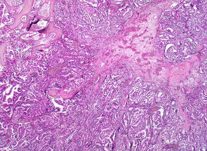 Grösseres Infiltrat eines Adenokarzinoms mit dos à dos liegenden Drüsenschläuchen. Areal mit Granulationsgewebe und kleinen Knochenresten.