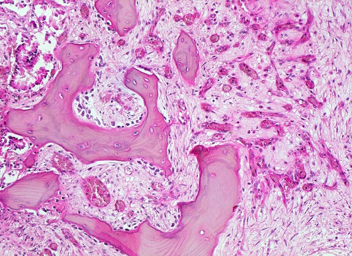 Links im Bild einzelne Karzinomdrüsen. Die erhaltenen Knochenbälkchen zeigen einen gesteigerten Umbau: sie sind herdförmig von einer Osteoblastentapete bedeckt im Sinne eines gesteigerten Anbaus. An einer Stelle ist ein Osteoklast in einer Resorptionslakune sichtbar. Die Markräume rechts im Bild sind mit gefässreichem Granulationsgewebe ausgefüllt.