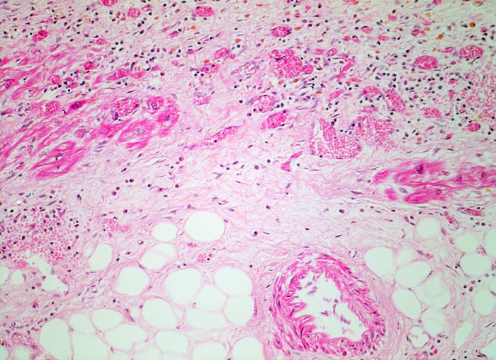 Das Granulationsgewebe besteht aus lockerem Bindegewebe, Kapillaren und gemischtem Entzündungsinfiltrat. Die hämosiderinhaltigen Makrophagen sind an ihrer gelben Farbe erkennbar. Im Granulationsgewebe eingeschlossen einzelne vitale Myokardzellen.