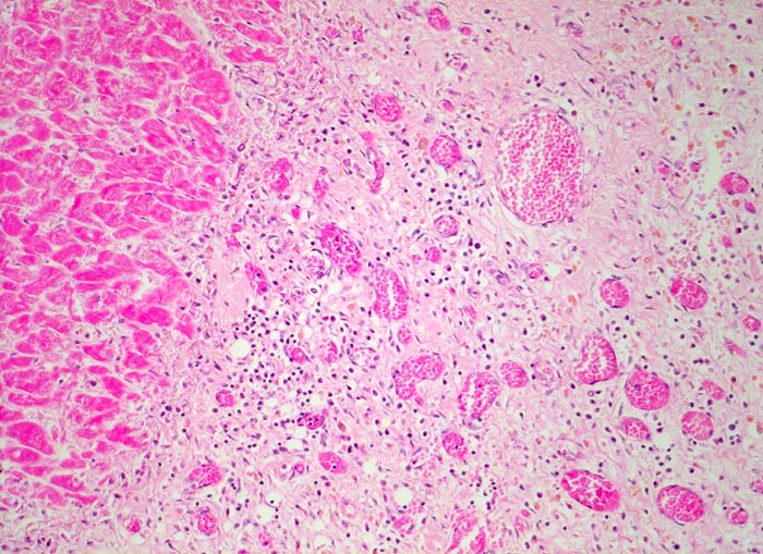 Das Granulationsgewebe rechts im Bild besteht aus lockerem Bindegewebe, Kapillaren und gemischtem Entzündungsinfiltrat. Die hämosiderinhaltigen Makrophagen sind an ihrer gelben Farbe erkennbar. Links im Bild die Koagulationsnekrose mit schollig zerfallenen hypereosinophilen Myokardfasern.