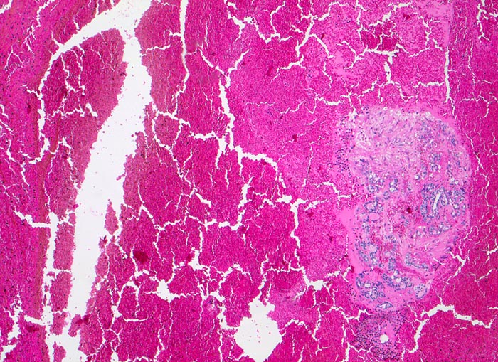 Insel von mikrofollikulärem Schilddrüsenparenchym umgeben von Frischblut.